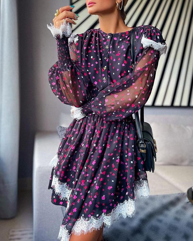 Poker Pattern Print Lantern Sleeve Lace Trim Dress