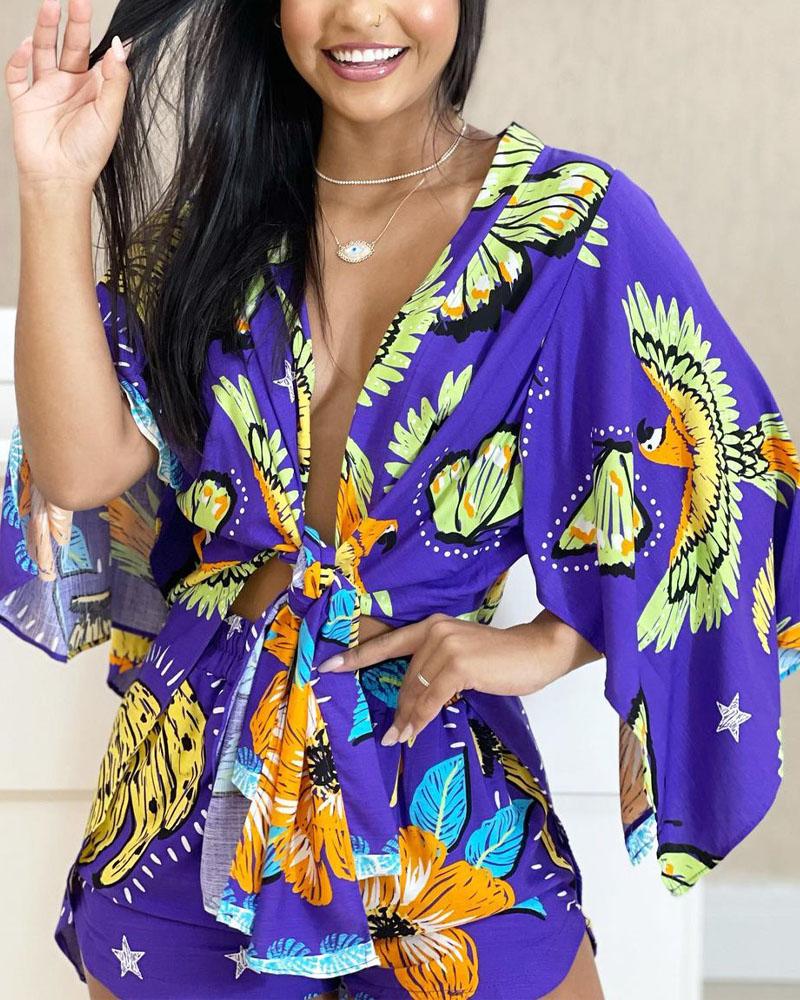 Style:Casual,Chic Type:Shorts Set Material:100%Polyester Neckline:V-Neck Sleeve Style:Cloak Sleeve,Three Quarters Length:Above Knee Pattern Type:Animal,Butterfly,Plants Decoration:Cloak Sleeve,Tied Detail Fit Type:Regular Occasion:Daily,Vacation Package Include:Shorts Set