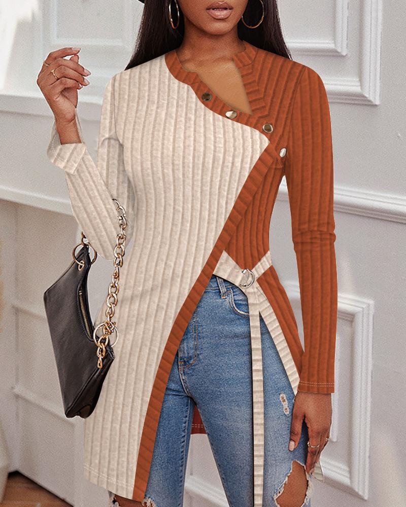 Style:Chic Type:Ribbed Top Material:Ribbed Neckline:Asymmetrical Neck Sleeve Style:Long Sleeve Length:Long Pattern Type:Colorblock Decoration:Button,Slit Fit Type:Skinny Occasion:Daily Package Include:1*Top Fabric Elasticity:Slight Stretch