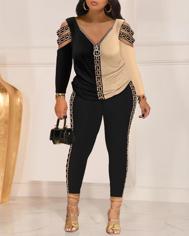 Style:Casual,Chic Type:Pants Sets Material:94%Polyester,6%Elastane Neckline:Cold Shoulder Sleeve Style:Long Sleeve Length:Long Pattern Type:Geometric,Contrast Paneled Decoration:Cutout,Zipper Fit Type:Regular Occasion:Daily Package Include:1*Pants Set Fabric Elasticity:Slight Stretch Sheer:No Care Instructions:Machine wash or professional dry clean