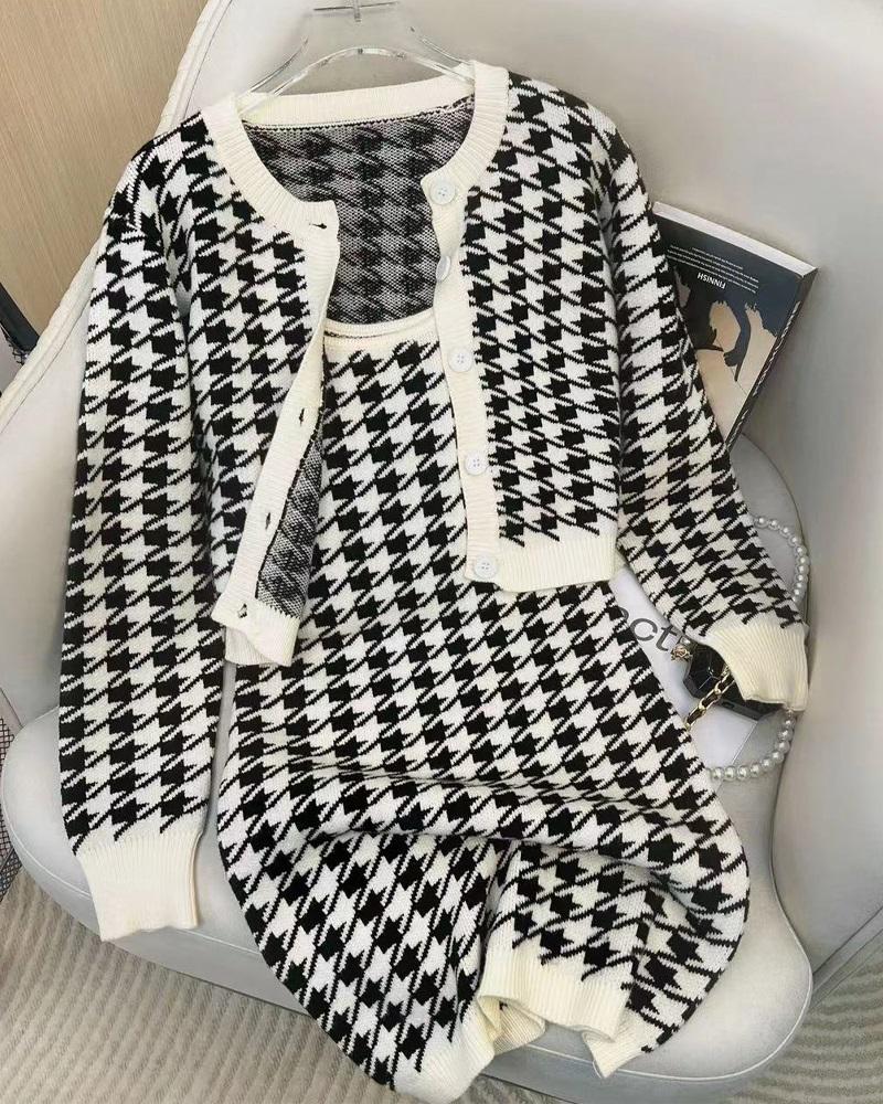 Contrast Paneled Houndstooth Pattern Knit Dress & Coat Set