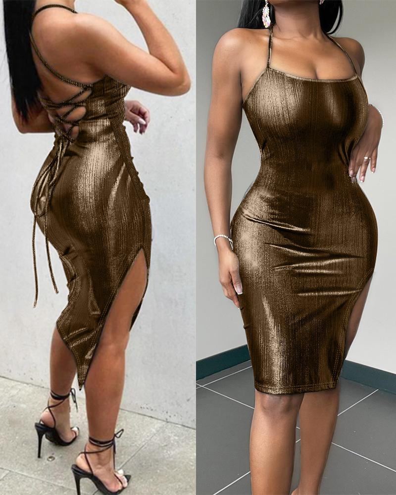 Style:Chic,Sexy Type:Bodycon Material:100%Polyester Neckline:Scoop Neck Sleeve Style:Sleeveless Length:Midi Pattern Type:Plain Decoration:Backless,Lace-up,Slit Fit Type:Skinny Occasion:Night Out,Party Package Include:1* Dress Fabric Elasticity:Slight Stretch Sheer:No Care Instructions:Do not wash