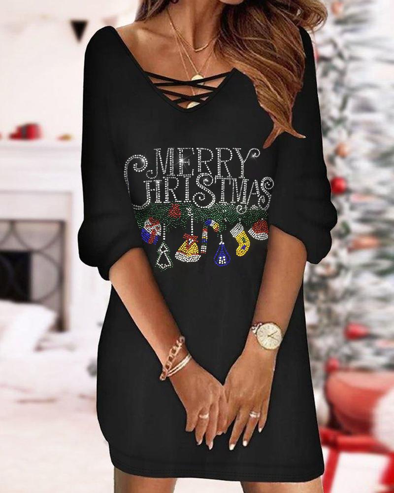 Rhinestone Merry Christmas Graphic Pattern Casual Dress