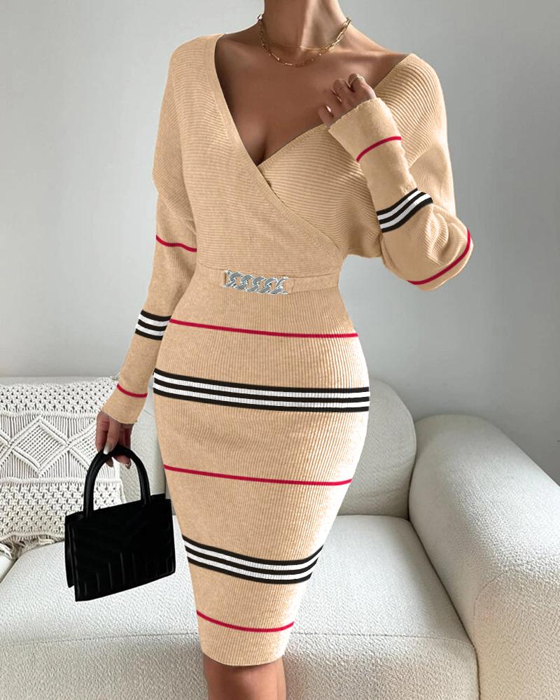 Striped Chain Decor Long Sleeve Knit Dress