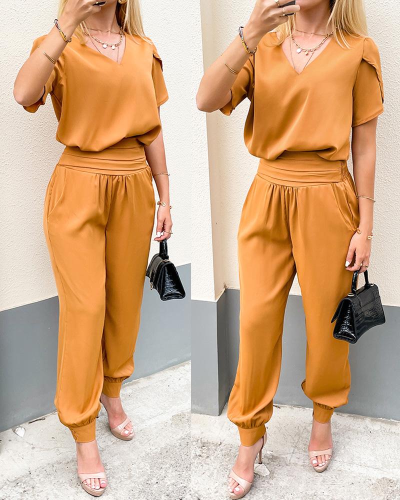 Style:Casual Type:Pants Sets Material:100%Polyester Neckline:V-Neck Sleeve Style:Short Sleeve Length:Long Pattern Type:Plain Decoration:Pocket Fit Type:Regular Occasion:Daily,Work Package Include:1*Pants Set Fabric Elasticity:Non-Stretch Sleeve Type:Puff Sleeve Sheer:No Care Instructions:Machine wash or professional dry clean