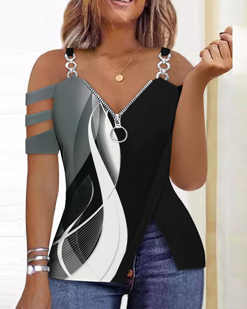 Style:Casual Type:Tee Material:97%Polyester,3%Spandex Neckline:Cold Shoulder Sleeve Style:Short Sleeve Length:Regular Pattern Type:Abstract Decoration:Cutout Fit Type:Skinny Occasion:Daily Package Include:1*T-Shirt Fabric Elasticity:Slight Stretch