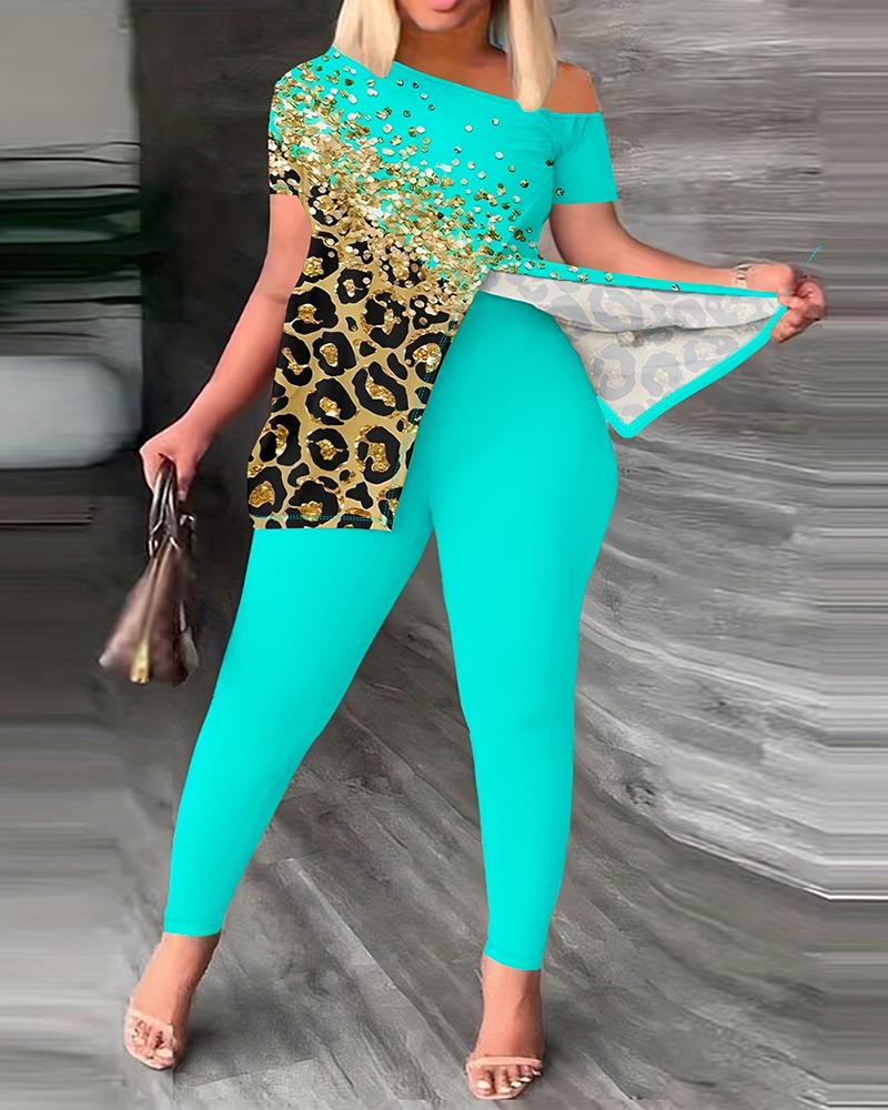 Style:Chic Type:Pants Sets Material:95%Polyester,5%Elastane Neckline:Skew Neck Sleeve Style:Short Sleeve Length:Long Pattern Type:Leopard Decoration:Slit Fit Type:Regular Occasion:Daily Package Include:1*Pants Set Fabric Elasticity:Non-Stretch