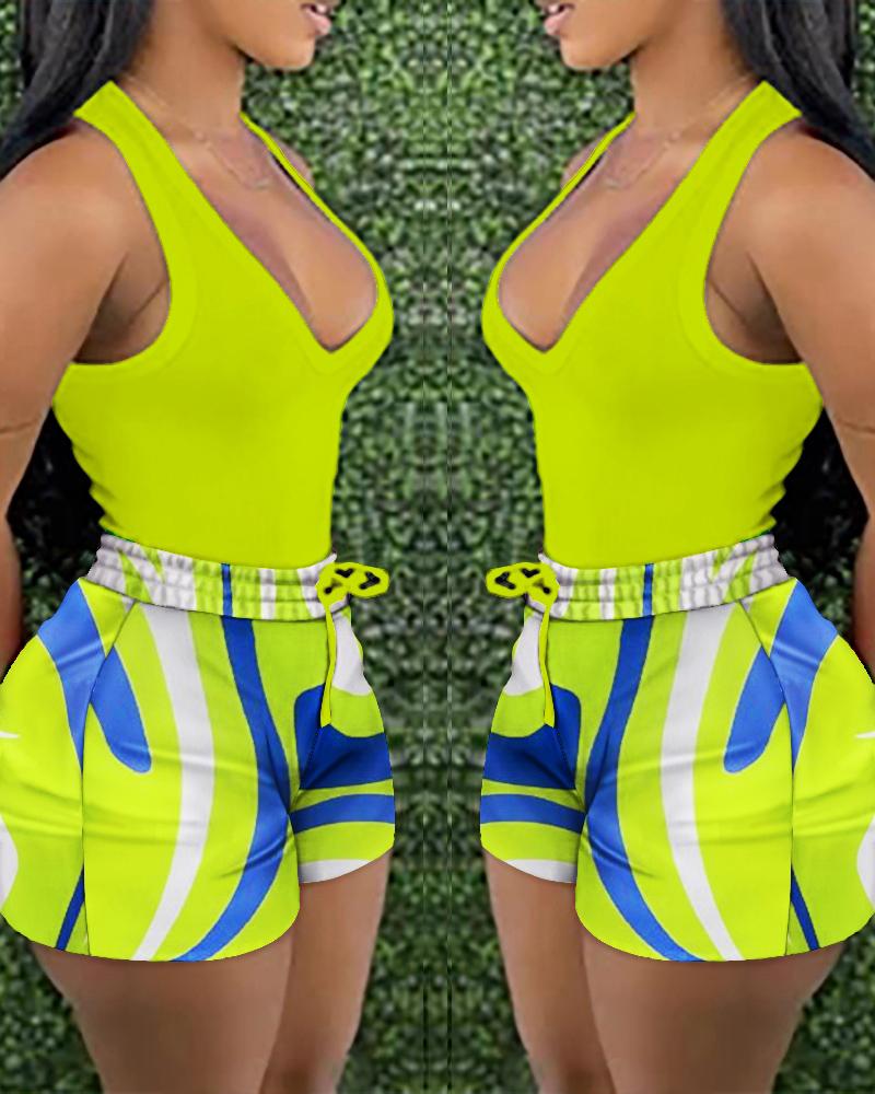 Style:Casual,Chic Type:Shorts Set Material:97%Polyester,3%Spandex Neckline:V-Neck Sleeve Style:Sleeveless Length:Above Knee Pattern Type:All Over Print,Colorblock,Plain Decoration:Drawstring Fit Type:Skinny Occasion:Daily Package Include:1*Shorts Set Fabric Elasticity:Non-Stretch