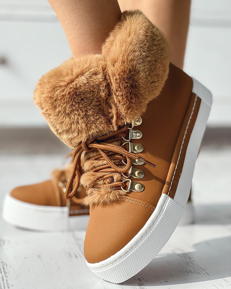 Style:Chic Type:Boots Material:Suede Pattern Type:Contrast Paneled Decoration:Lace-up Occasion:Daily Toe:Round Toe Heel Height:High Heel Package Include:1*Snow Boots