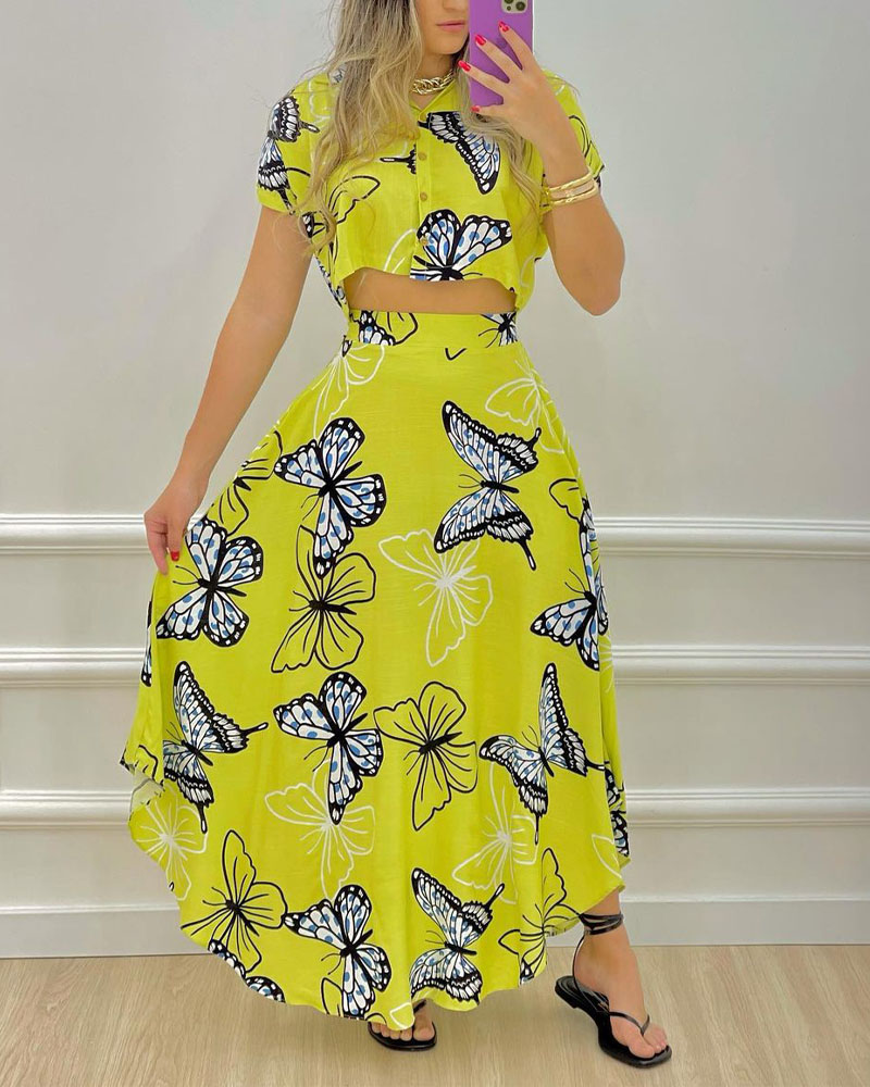 Style:Casual,Chic Type:Skirt Sets Material:Polyester Neckline:Turn-down Collar Sleeve Style:Short Sleeve Length:Maxi Pattern Type:Butterfly Decoration:Button Fit Type:Regular Occasion:Daily Package Include:Skirt Set
