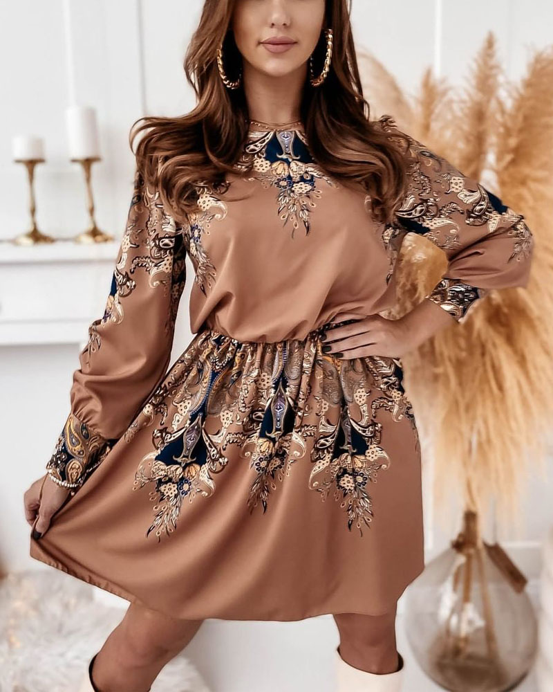 Style:Casual,Chic Type:A Line Material:100%Polyester Neckline:Round Neck Sleeve Style:Long Sleeve Length:Mini Pattern Type:Baroque Fit Type:Regular Occasion:Daily Package Include:1* Dress