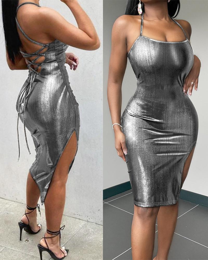Style:Chic,Sexy Type:Bodycon Material:100%Polyester Neckline:Scoop Neck Sleeve Style:Sleeveless Length:Midi Pattern Type:Plain Decoration:Backless,Lace-up,Slit Fit Type:Skinny Occasion:Night Out,Party Package Include:1* Dress Fabric Elasticity:Slight Stretch Sheer:No Care Instructions:Do not wash