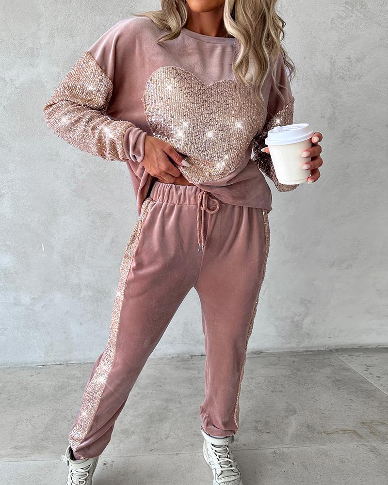 Colorblock Heart Pattern Contrast Sequin Top & Pants Set