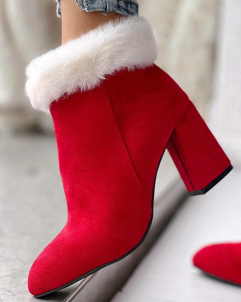 Fuzzy Detail Chunky Heel Ankle Boots