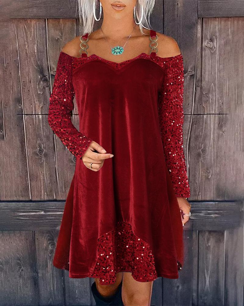 Contrast Sequin Cold Shoulder Velvet Casual Dress