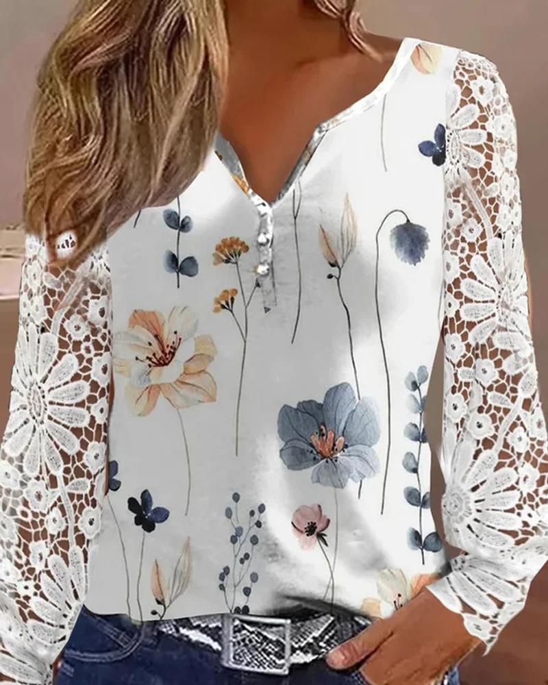 Style:Casual Type:Blouses Material:97%Polyester,3%Spandex Neckline:Notch Neck Sleeve Style:Long Sleeve Length:Regular Pattern Type:Floral Decoration:Button,Contrast Lace Fit Type:Regular Occasion:Daily Package Include:1* Blouse Fabric Elasticity:Slight Stretch Sheer:No Care Instructions:Machine wash or professional dry clean