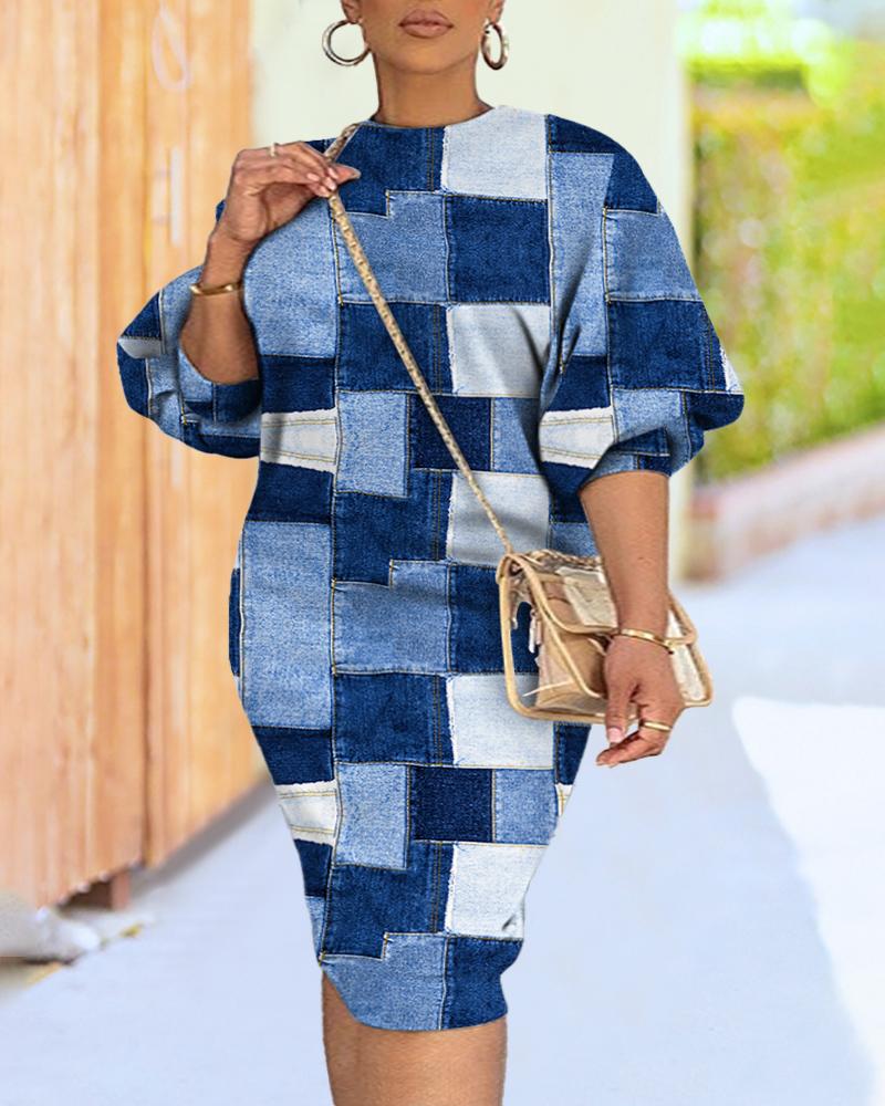 Plus Size Denim Look Print Lantern Sleeve Casual Dress