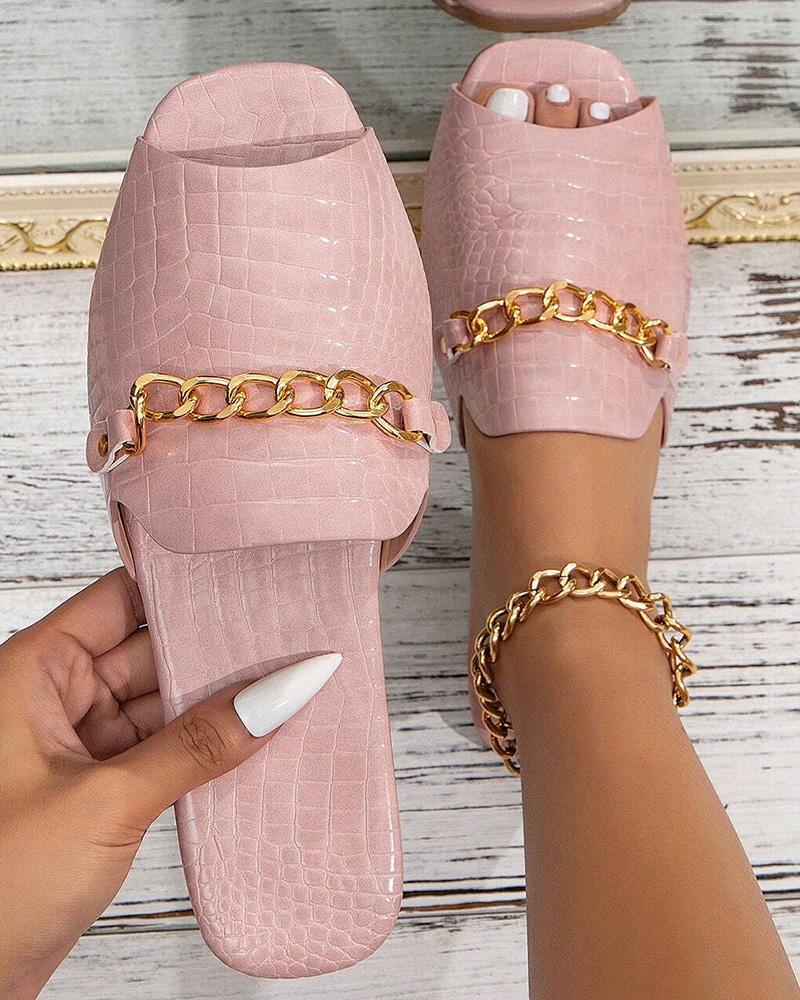 Style:Casual Type:Slippers Pattern Type:Crocodile Decoration:Chain Occasion:Daily Toe:Peep Toe Heel Height:Flat Package Include:1*Slippers