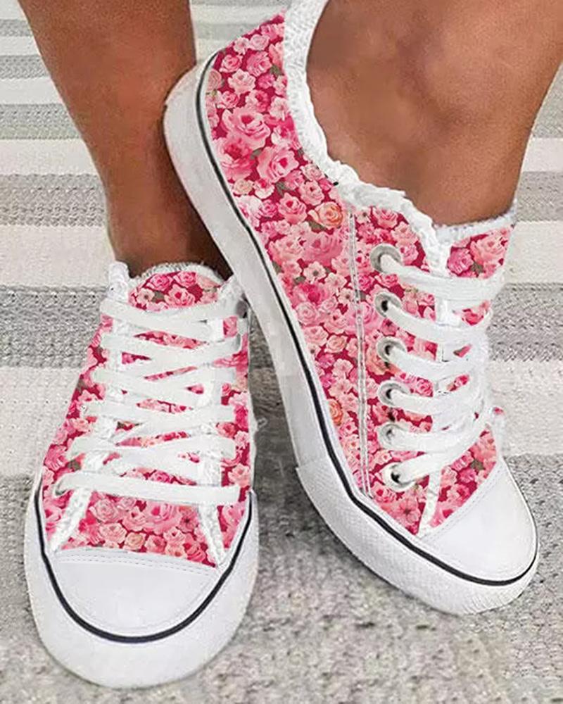 Floral Print Lace-up Fringe Hem Sneakers