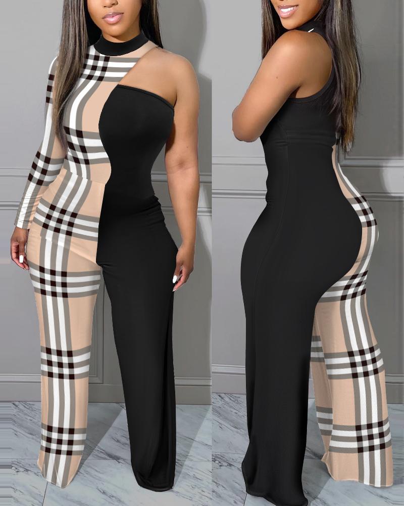 Plaid Print One Shoulder Long Sleeve Jumpsuit