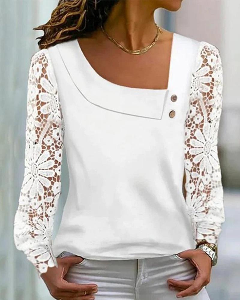 Style:Casual,Chic Type:Tee Material:100%Polyester Neckline:Asymmetrical Neck Sleeve Style:Long Sleeve Length:Regular Pattern Type:Plain Decoration:Button,Contrast Lace Fit Type:Regular Occasion:Daily Package Include:1*Top Fabric Elasticity:Slight Stretch Sheer:No Care Instructions:Machine wash or professional dry clean