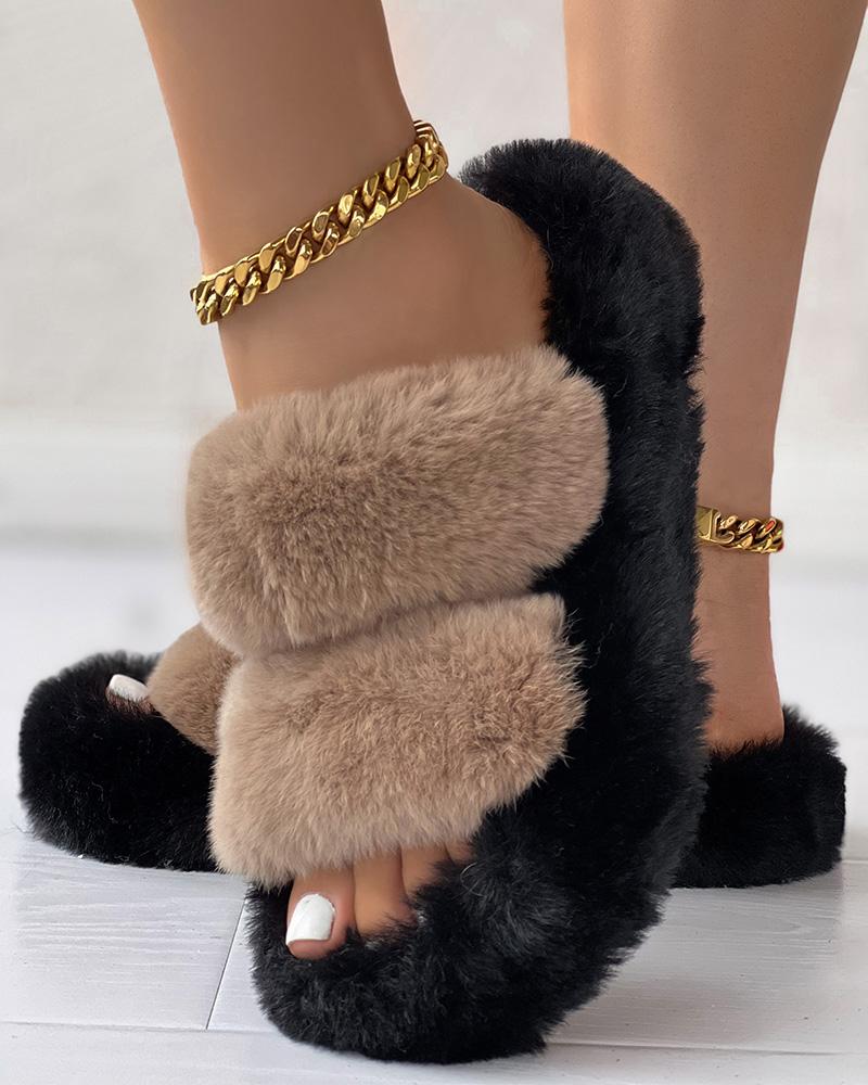 Double Strap Round Toe Fuzzy Slippers