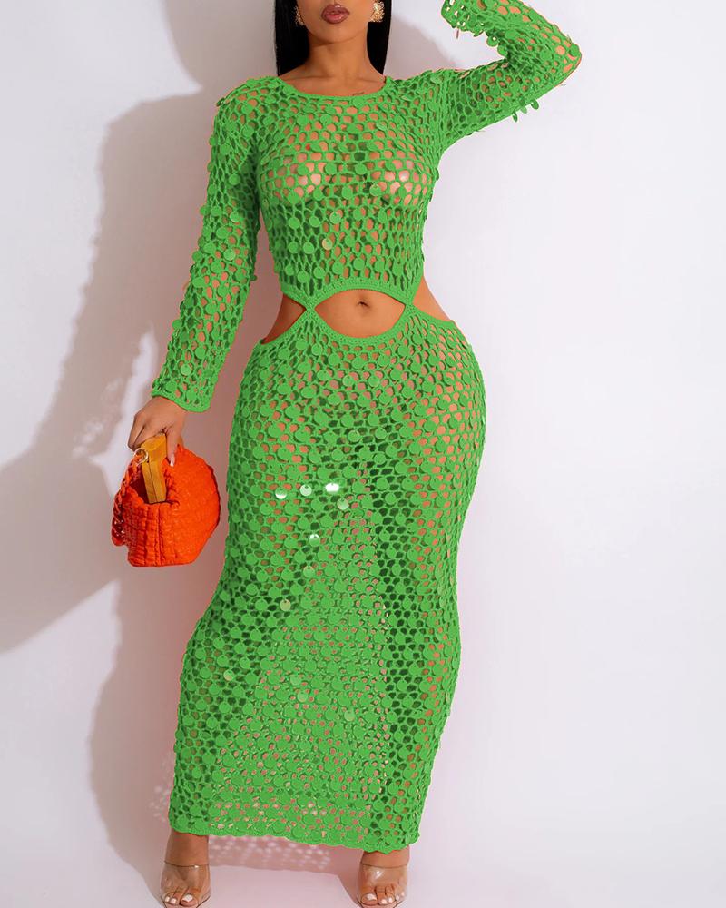 Style:Chic Type:Cover Ups Material:Acrylic Neckline:Round Neck Sleeve Style:Long Sleeve Length:Maxi Pattern Type:Plain Decoration:Hollow-out Fit Type:Regular Occasion:Daily,Vacation Package Include:1* Dress