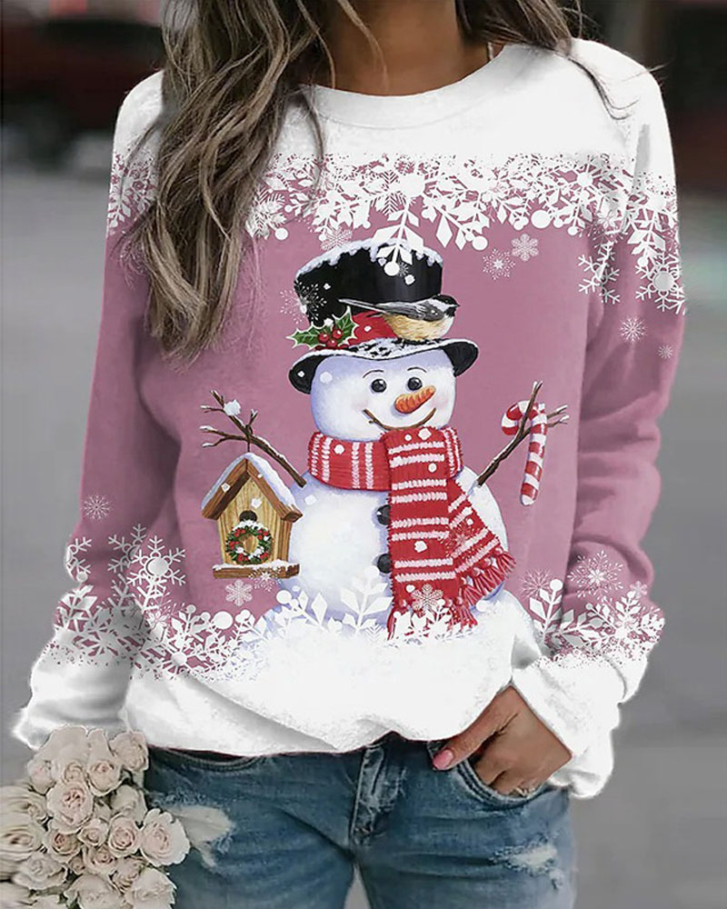 Christmas Snowflake Snowman Print Long Sleeve Top