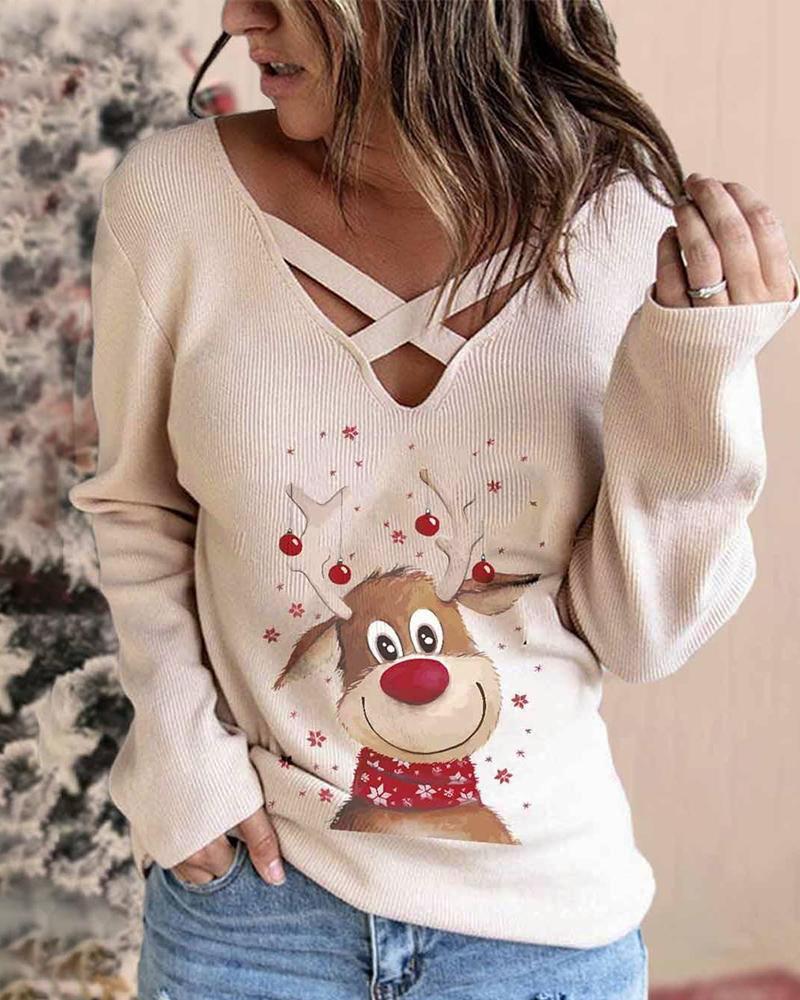 Christmas Elk Print Long Sleeve Top