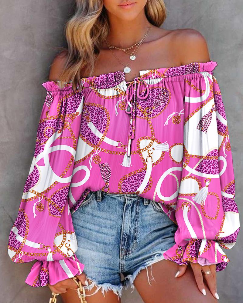 Scarf Chain Print Off Shoulder Lantern Sleeve Top