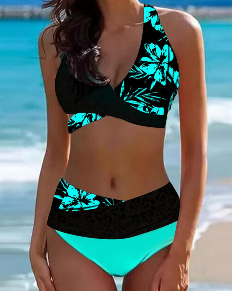 Floral Print Colorblock V-Neck Crisscross Bikini Set