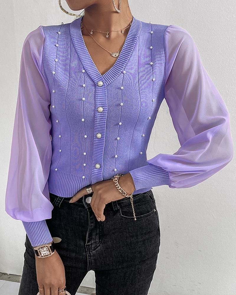 Lantern Sleeve Beaded Sheer Mesh Patch Knit Cardigan