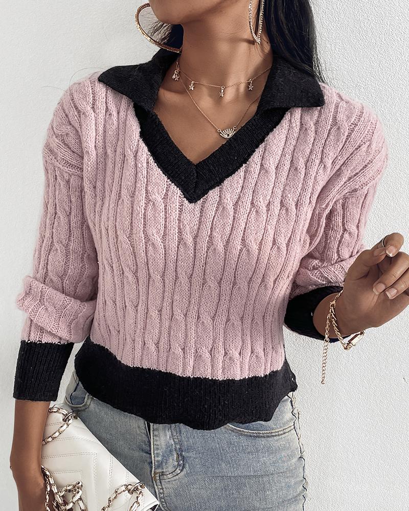 Style:Chic Type:Sweater Material:Acrylic Neckline:Turn-down Collar,V-Neck Sleeve Style:Long Sleeve Length:Regular Pattern Type:Colorblock Decoration:Others Fit Type:Regular Occasion:Daily Package Include:1*Sweater Fabric Elasticity:Slight Stretch
