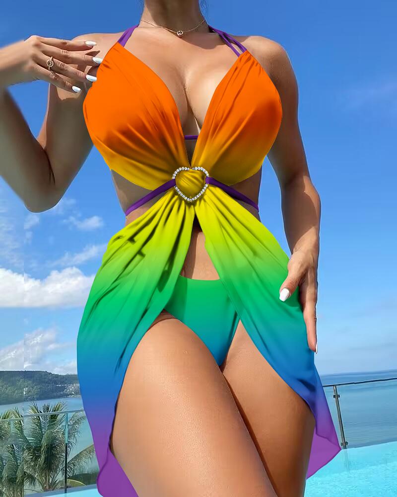 3PCS Print Halter Bikini Swimsuit Cover Ups