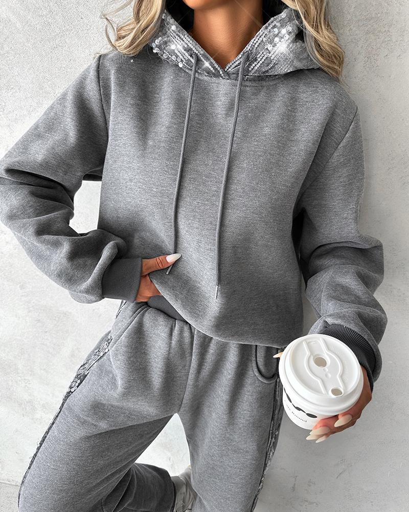 Contrast Sequin Hooded Sweatshirt & Pocket Design Sweatpants Set