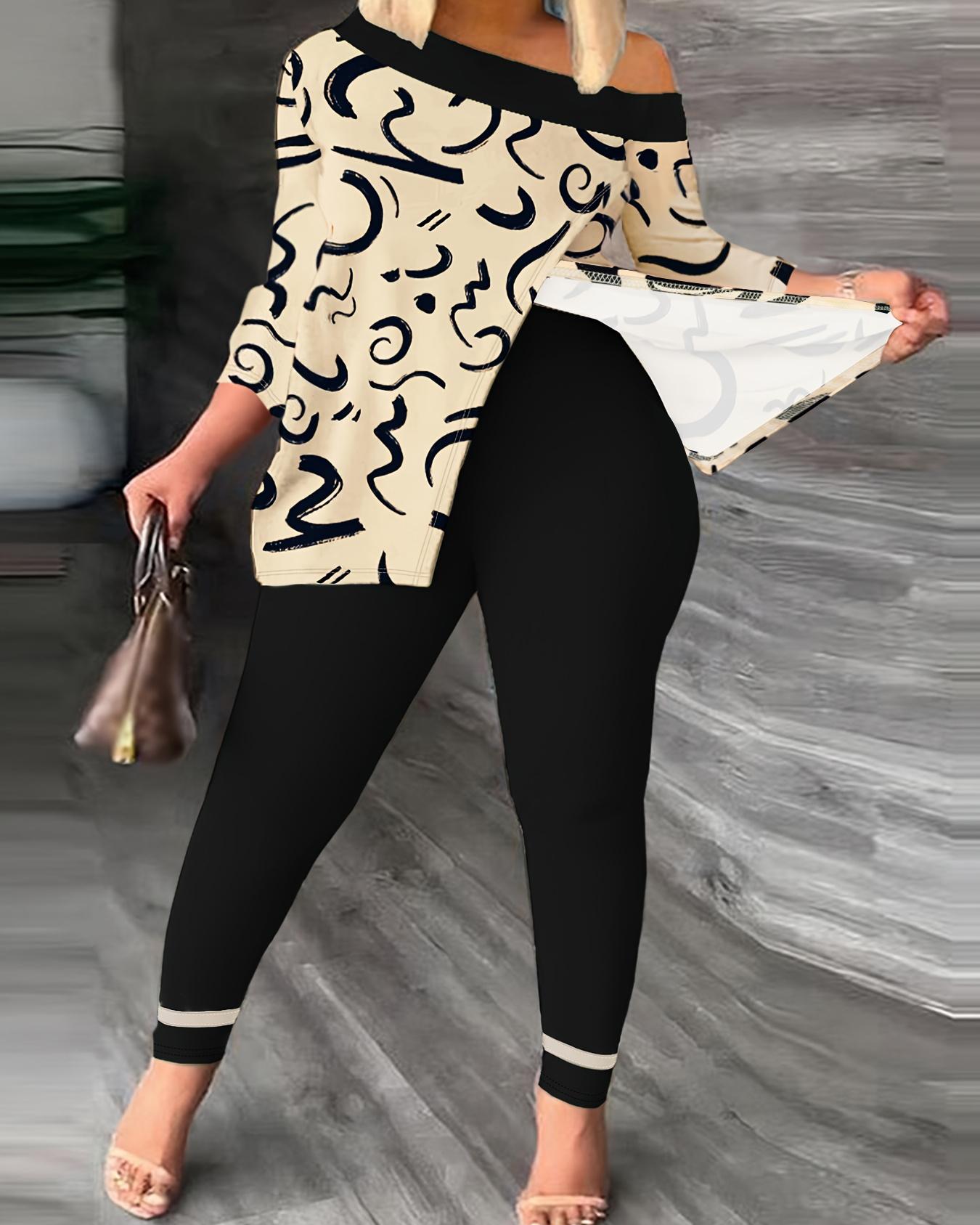 Plus Size Abstract Print Skew Neck Split Hem Top & Pants Set