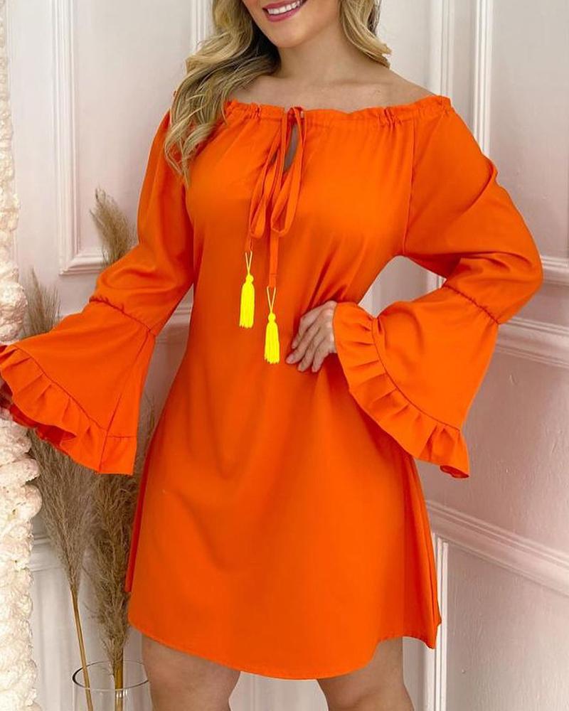 Style:Chic Type:A Line Material:100%Polyester Neckline:Off the Shoulder Sleeve Style:Long Sleeve Length:Mini Pattern Type:Plain Decoration:Ruffles,Tassel Fit Type:Regular Occasion:Daily Package Include:1* Dress Fabric Elasticity:High Stretch Sleeve Type:Bell Sleeve Sheer:No Care Instructions:Machine wash or professional dry clean