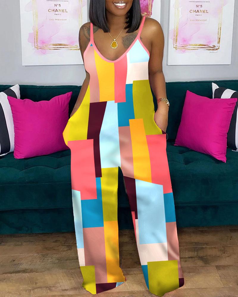 Style:Basics,Casual Type:Jumpsuit Material:97%Polyester,3%Spandex Neckline:V-Neck Sleeve Style:Spaghetti Strap Length:Long Pattern Type:Colorblock,Geometric Decoration:Pocket Fit Type:Oversized Occasion:Daily Package Include:1*Jumpsuit Fabric Elasticity:Non-Stretch Sheer:No Care Instructions:Machine wash or professional dry clean