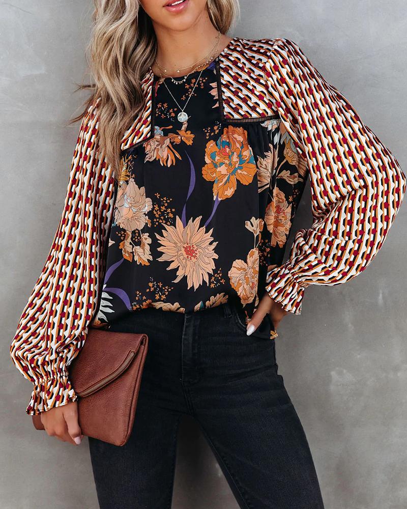 Floral Geo Print Patchwork Flounce Sleeve Top