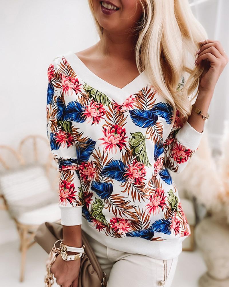 Style:Casual Type:Tee Material:Polyester Neckline:V-Neck Sleeve Style:Long Sleeve Length:Regular Pattern Type:Tropical Fit Type:Regular Occasion:Daily Package Include:1*T-Shirt