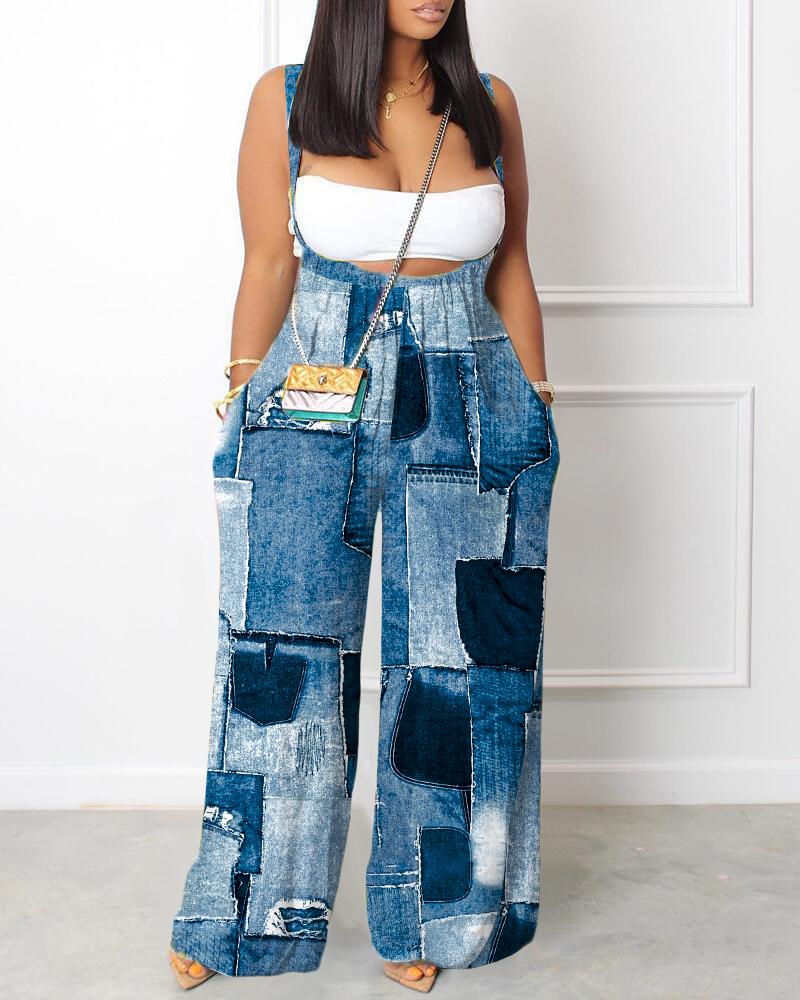Denim Look Print Wide Leg Suspender Jumpsuit