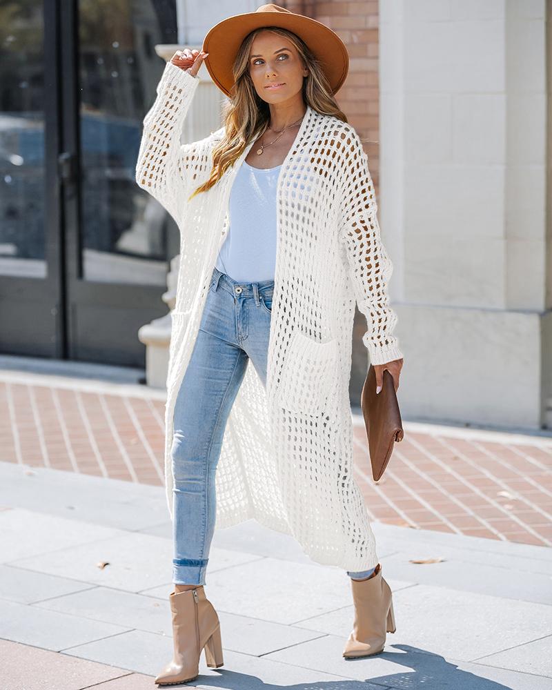 Style:Chic Type:Cardigan Material:Acrylic Neckline:Open Front Sleeve Style:Long Sleeve Length:Long Pattern Type:Plain Decoration:Hollow-out,Pocket Fit Type:Regular Occasion:Daily Package Include:1*Cardigan Fabric Elasticity:Slight Stretch Sheer:No Care Instructions:Hand wash or dry clean