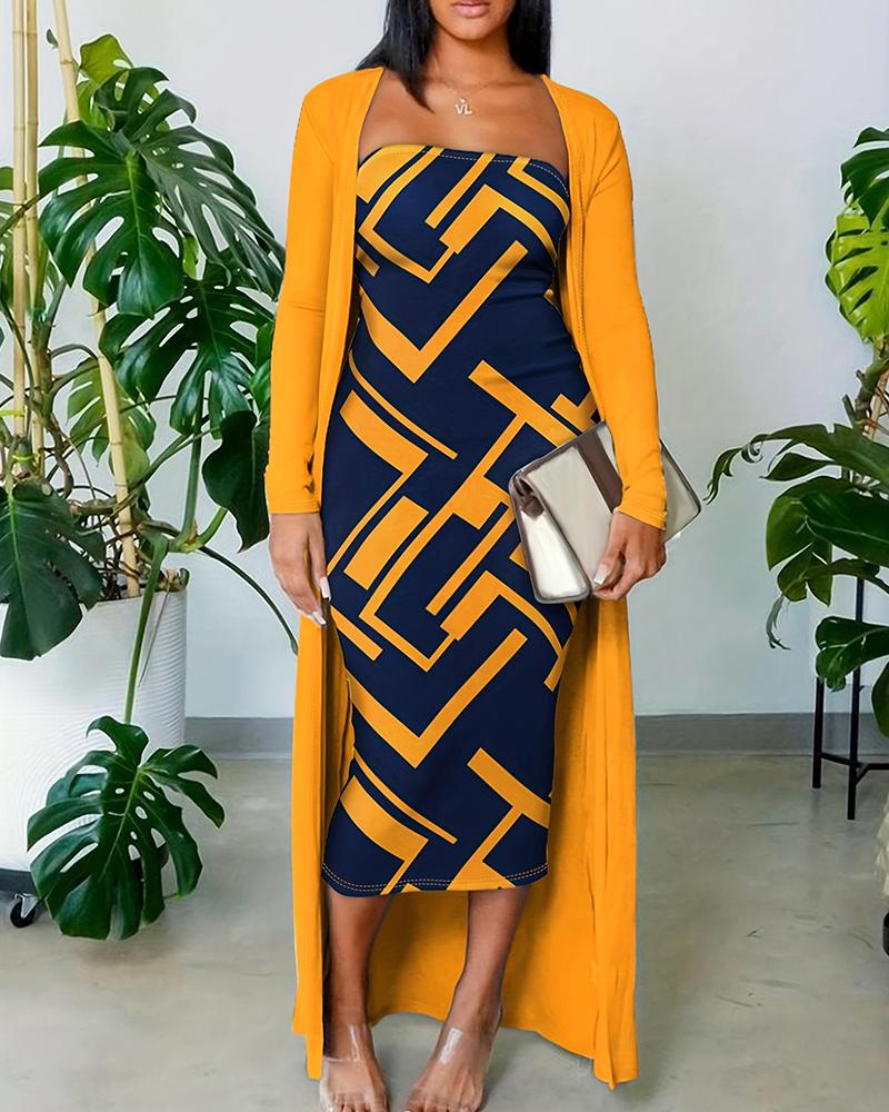 Style:Casual,Chic Type:Suit Set Material:95%Polyester,5%Elastane Neckline:Bandeau,Open Front Sleeve Style:Long Sleeve,Sleeveless Length:Mid-Calf Pattern Type:Geometric Decoration:Others Fit Type:Skinny Occasion:Daily Package Include:1*Dress(With Coat) Fabric Elasticity:Non-Stretch