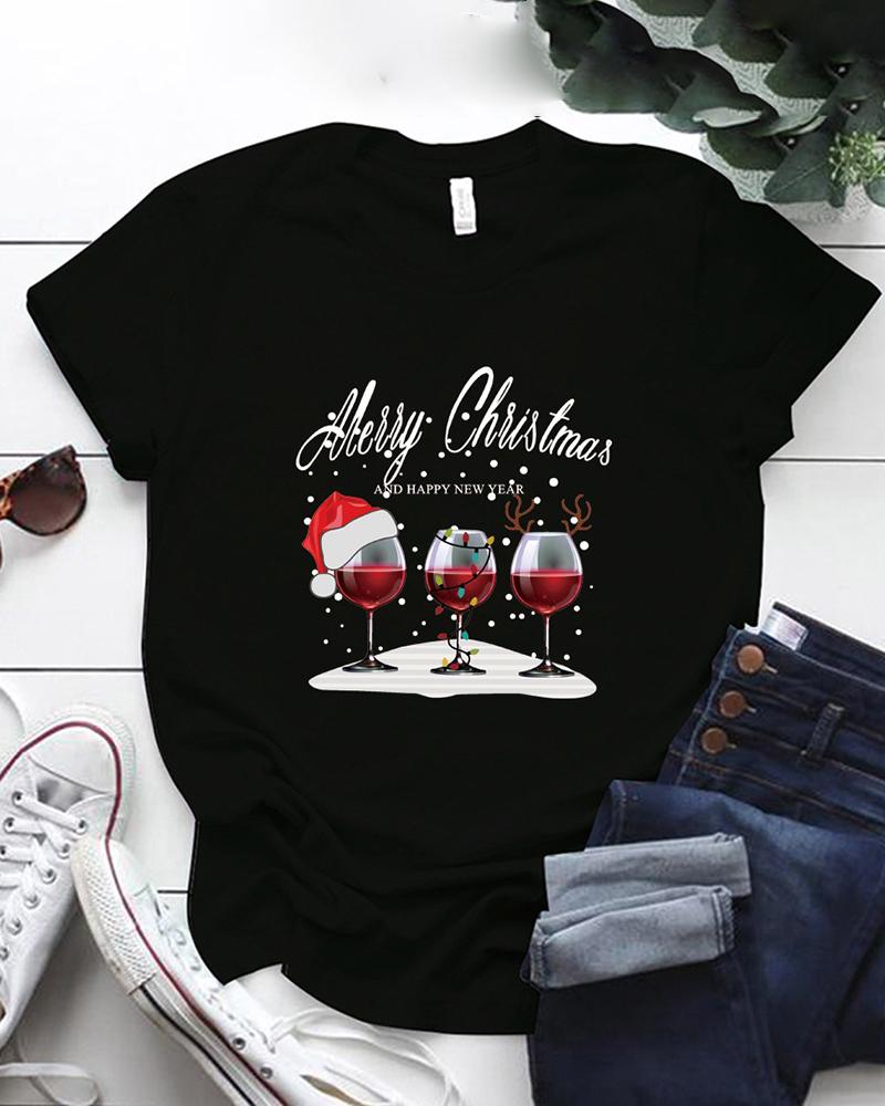Christmas Wine Glasses Letter Print Short Sleeve T-shirt