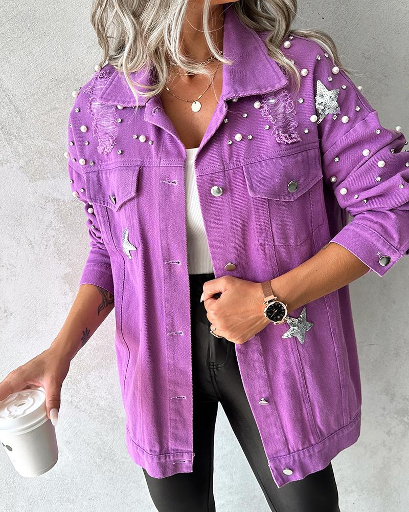 Style:Chic Type:Denim Jackets & Coats Material:100%Denim Neckline:Turn-down Collar Sleeve Style:Long Sleeve Length:Regular Pattern Type:Plain Decoration:Beaded,Pocket,Ripped Fit Type:Regular Occasion:Daily Package Include:1*Jacket Fabric Elasticity:Slight Stretch Sheer:No Care Instructions:Hand wash, do not dry clean