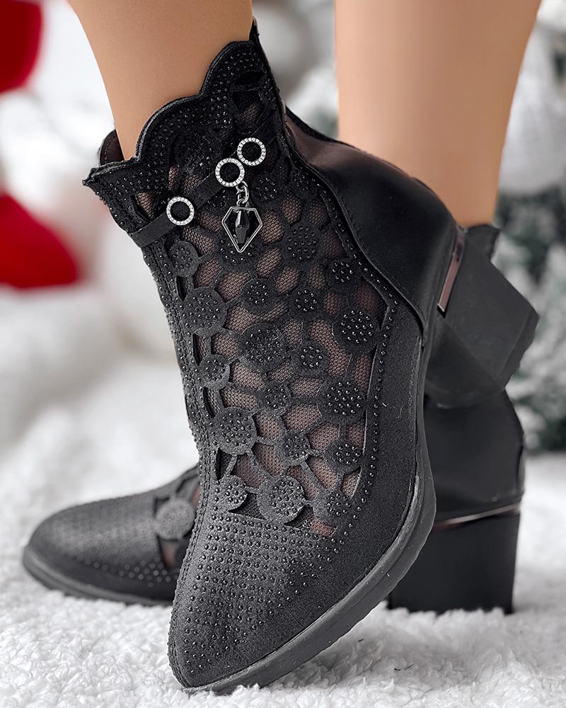 Rhinestone Hollow Out Breathable Chunky Heel Ankle Boots