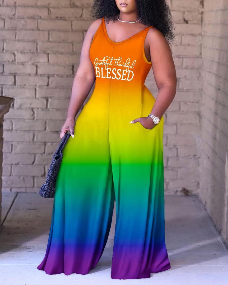 Plus Size Ombre Grateful Thankful Blessed Print Wide Leg Jumpsuit