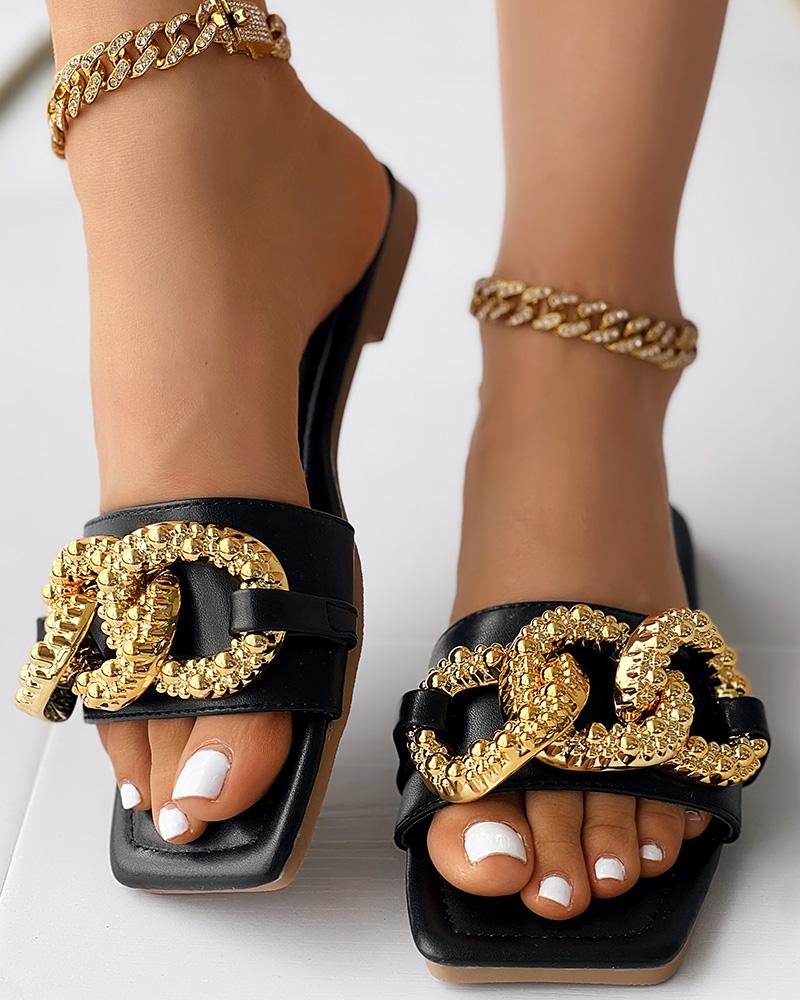 Style:Chic Type:Slippers Pattern Type:Plain Decoration:Chain Occasion:Daily Toe:Open Toe,Square Toe Heel Height:Flat Package Include:1*Slippers