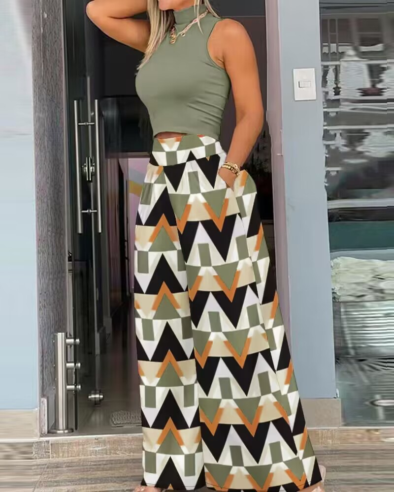 High Neck Sleeveless Top & Geometric Print Wide Leg Pants Set