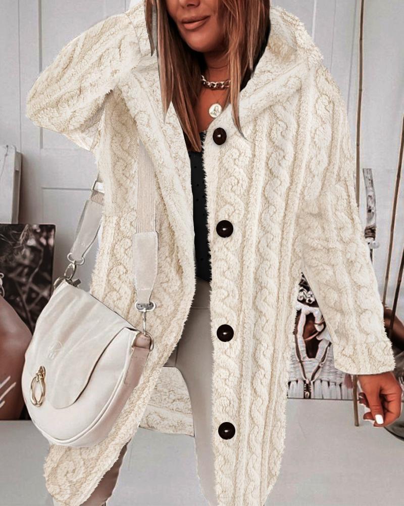 Fuzzy Textured Buttoned Fleece Hooded Coat